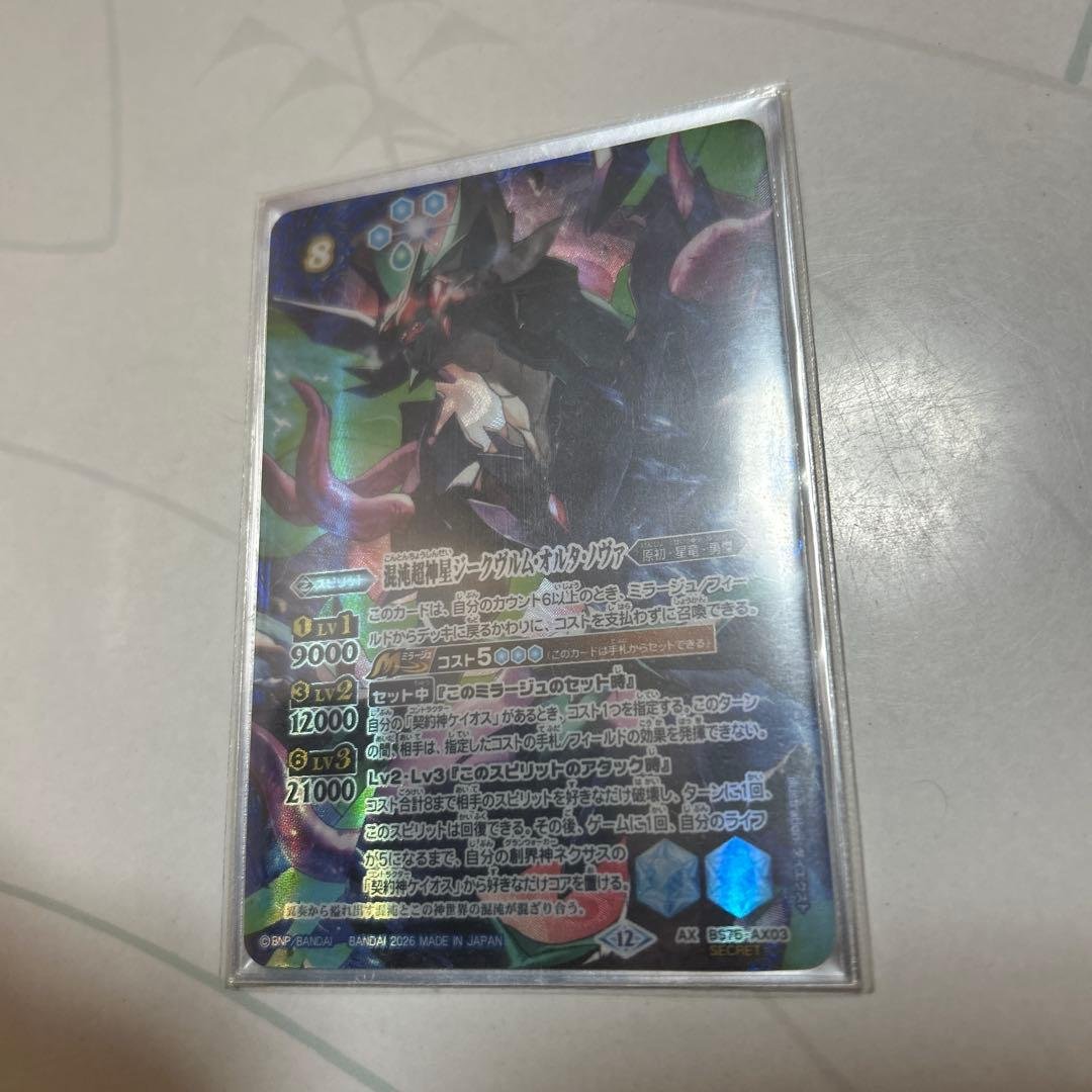 - 3パック購入で全てホロ、X、各1枚、M2枚、レア6枚の構成でした。ホロはジーク・スサノ・フリード、ロード・ドラゴン・バゼル、セイバーの3つでダブリなしでした。Mレア、レアとも最近始めた我が家にとっては持っていないものが多かったのでよかったです。